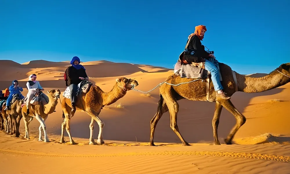 Camel Ride Experience: The highlight of your day is the camel ride. You’ll meet your camel, a friendly and gentle animal, well-trained for riding. With the help of experienced guides, you’ll mount your camel and start your journey across the golden dunes. As you ride, the gentle sway of the camel will allow you to feel the rhythm of the desert, just as travelers of old once did. This ride offers a peaceful, immersive experience, giving you time to enjoy the vast, beautiful landscape around you.